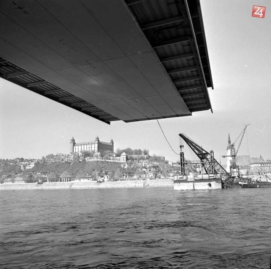 Na archívnej snímke z 28. apríla 1971 časť mostnej konštrukcie sa týči nad Dunajom.