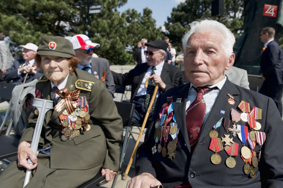 Frontová zdravotná sestra plukovníčka v.v. Mária Pelcrová a účastník oslobodzovacích bojov na Slovensku podplukovník v.v. Juraj Bilo počas pietneho aktu pri príležitosti 71. výročia Dňa víťazstva nad fašizmom na pamätníku na Slavíne